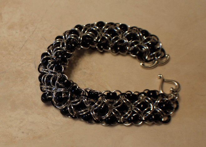 Previous ImageNext Image Black beads criss cross chainmaille bracelet Black beads criss cross chainmaille bracelet Black beads and Aluminium chainmaille rings make up this beautiful chunky bracelet with a heart Shaped toggle clasp. Like Loading...