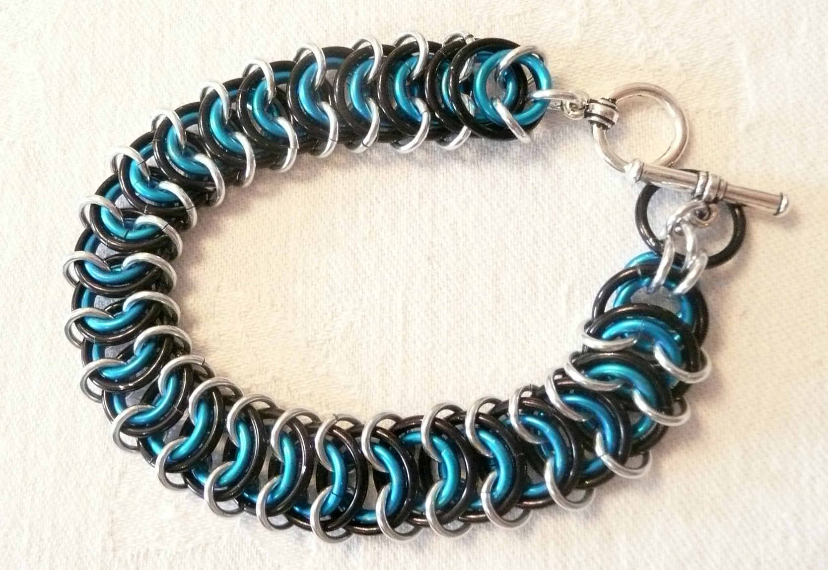 Previous ImageNext Image C87 Blue Black gold chainmaille rings in kingscale weave bracelet with SP toggle Like Loading...