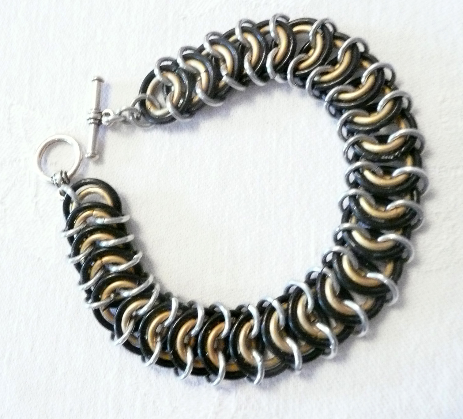 Previous ImageNext Image C88 Brown gold and silver chainmaille rings in Kingscale weave bracelet Like Loading...