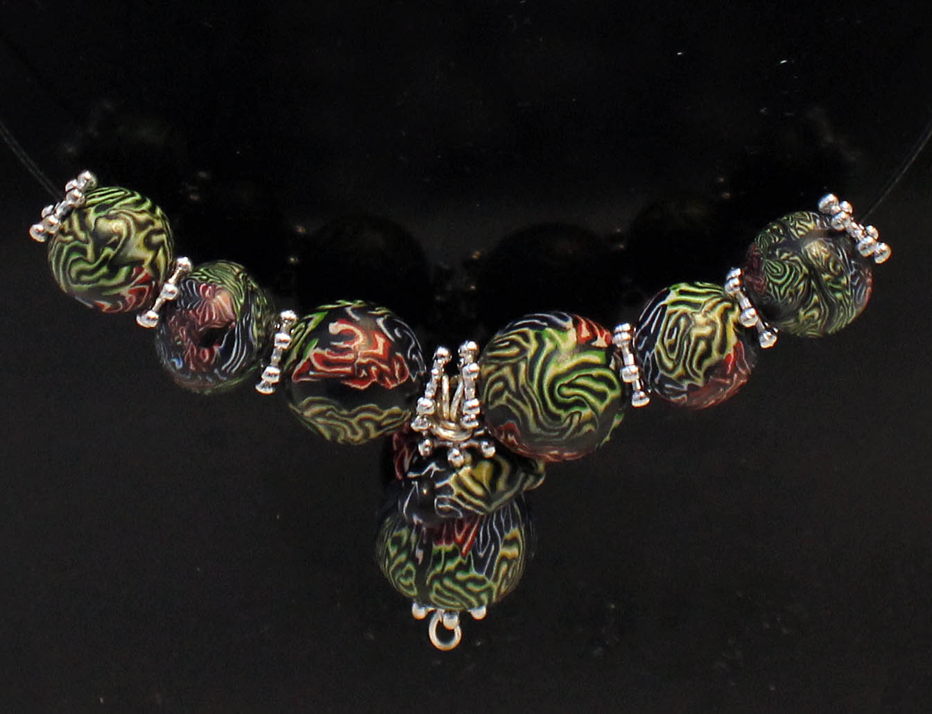 Previous ImageNext Image IMG_6280 polymer clay brain cane beads with Silver colour snowflake spacers on rigid black covered steel wire Brain cane beads and acorn shaped drop on rigid necklace. Like Loading...