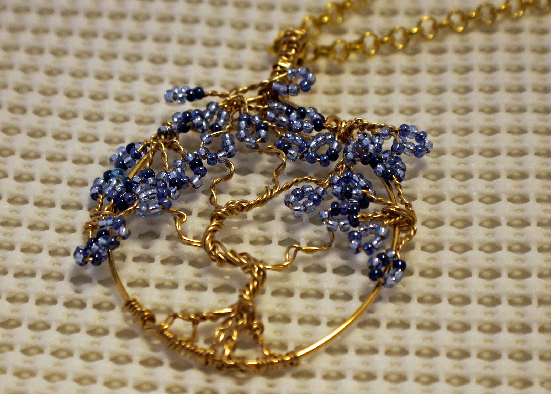 tree of life pendant blue seed bead and wire wrap